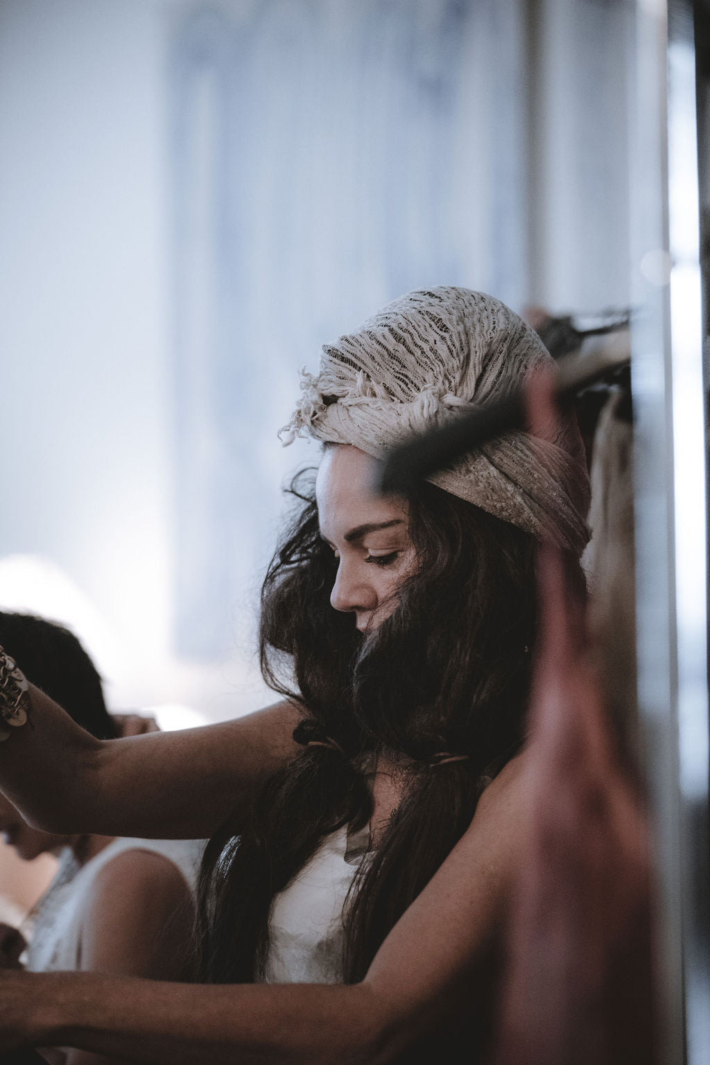 A familiar finishing touch — tied as a turban, it adds personality and continuity throughout her edits.